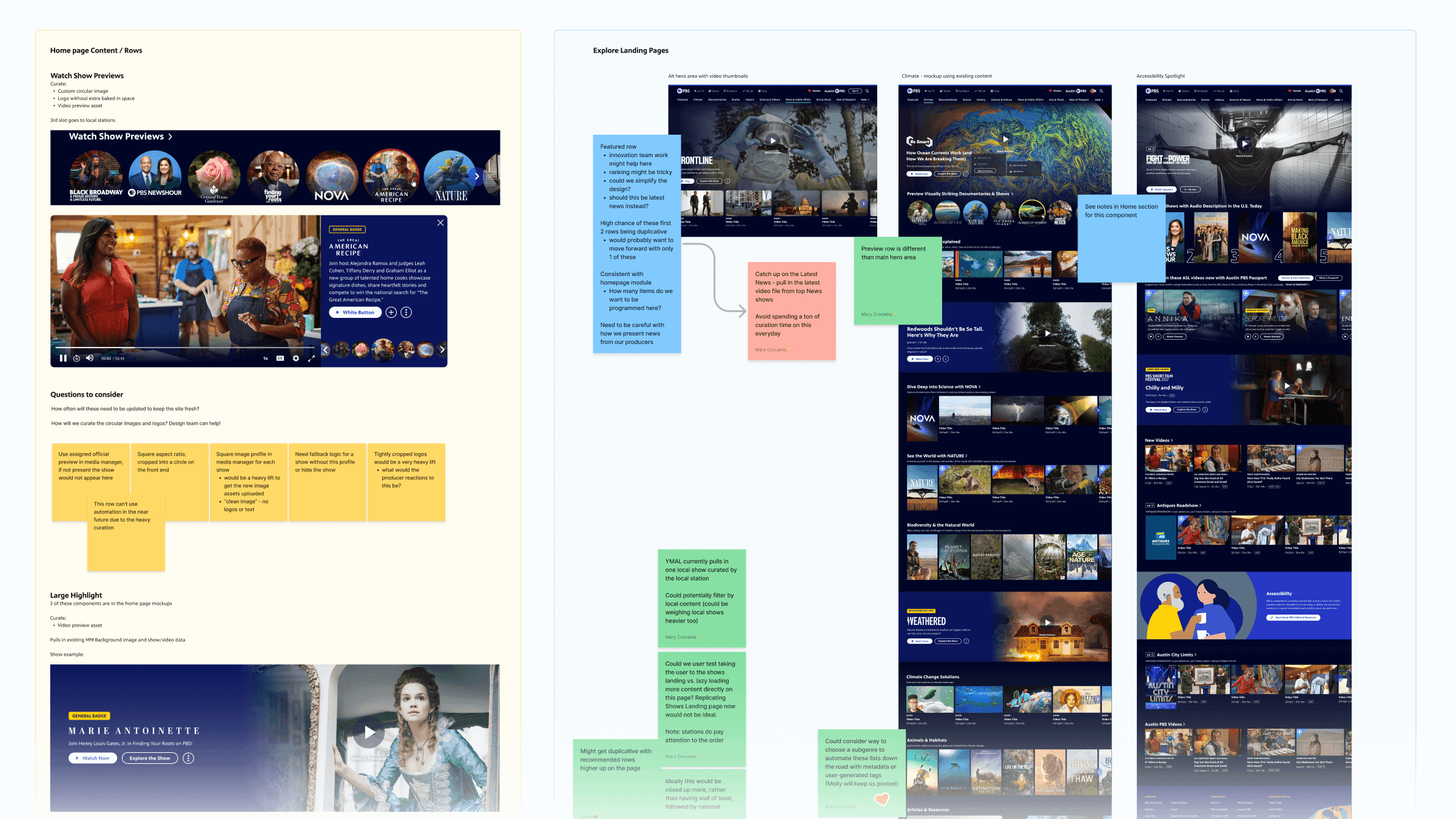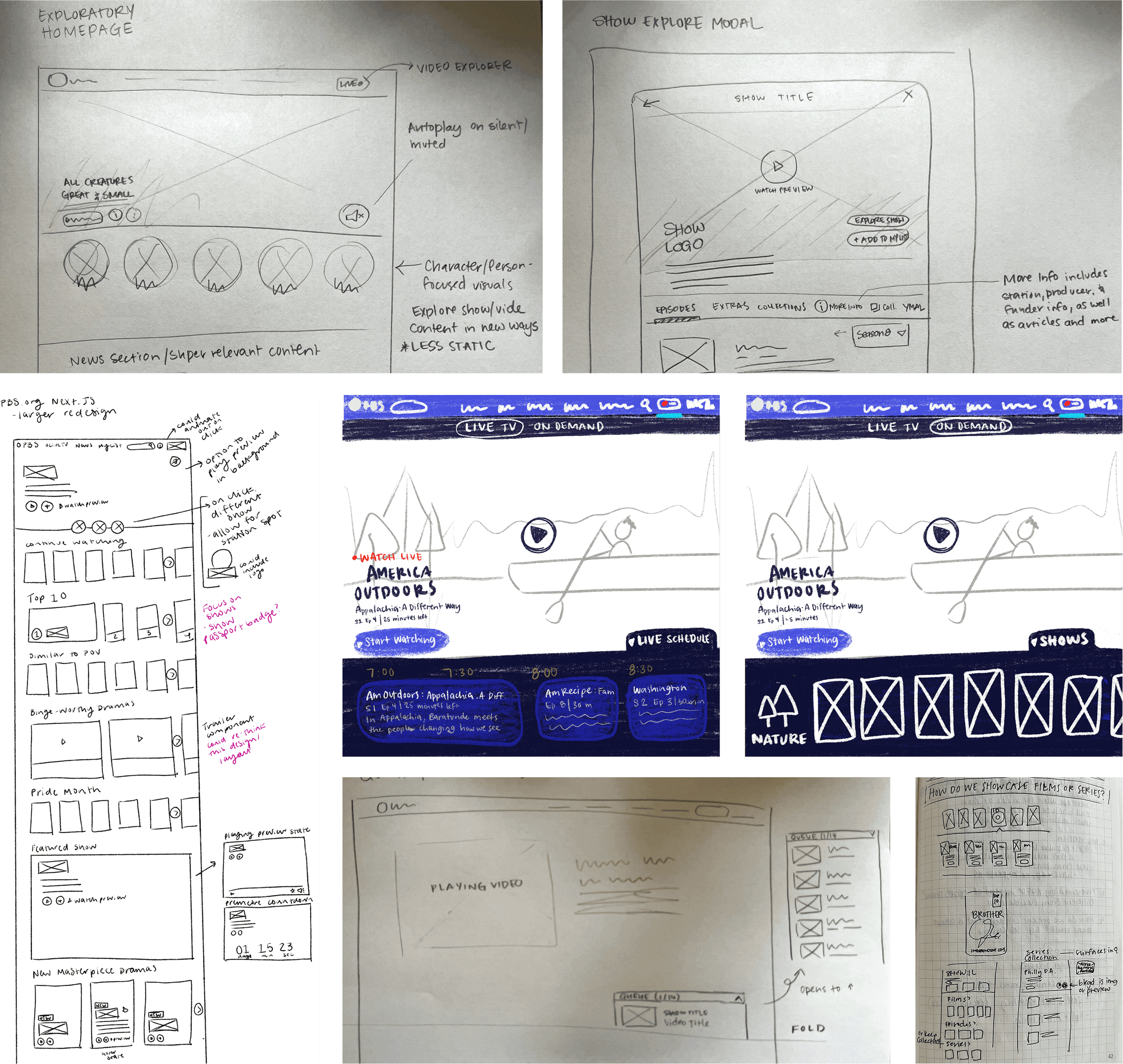 Over several weeks, two of my team members and I would come to our weekly meetings with new ideas. We would critique and build off of high-fidelity wireframes until we started fleshing out the initial designs of the reimagined pbs.org. In those first weeks, I encouraged blue sky thinking, knowing that the pbs.org website is our most flexible platform and this was our biggest opportunity for making significant UX and UI changes. We followed a similar, but compressed, process for apps explorations once it came time for that.