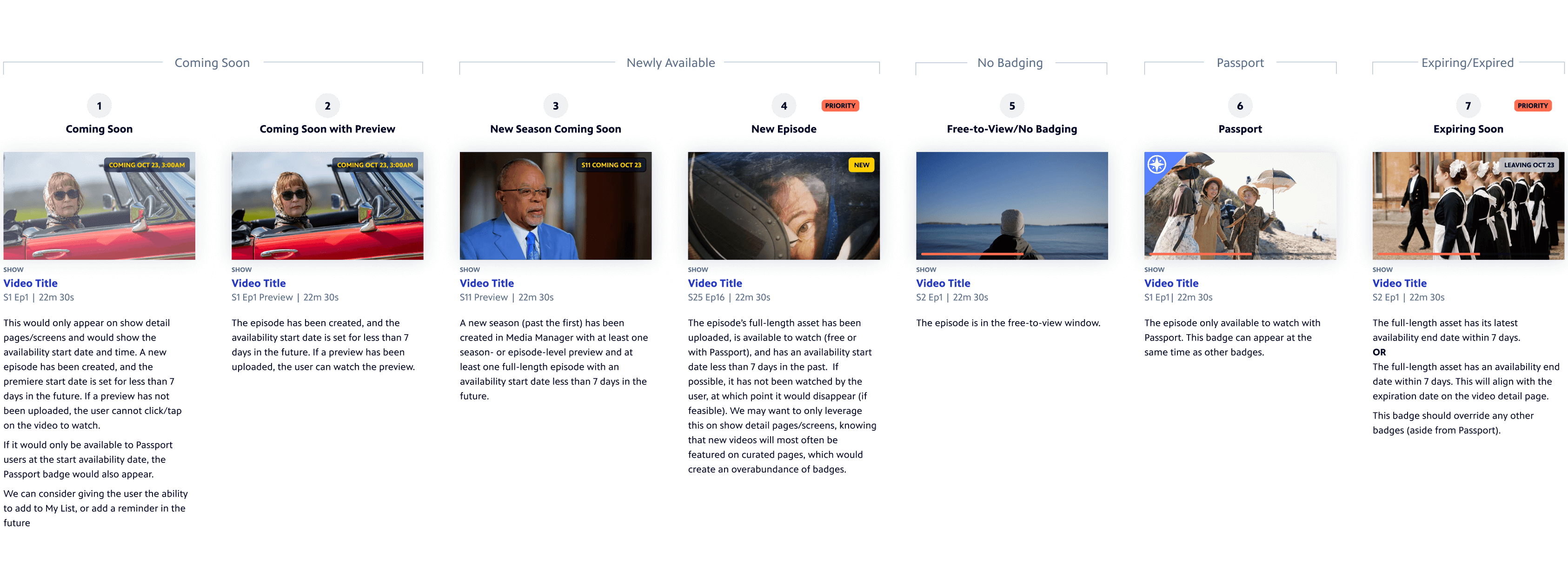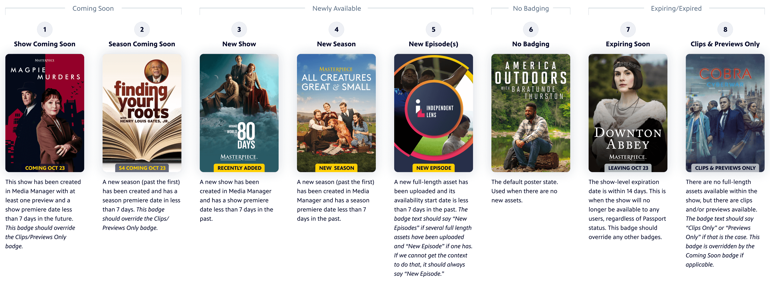 • Logic for a new set of show and video badges to help users easily identify content that is new or leaving soon. This will solve user confusion about content availability while reducing support inquiries.