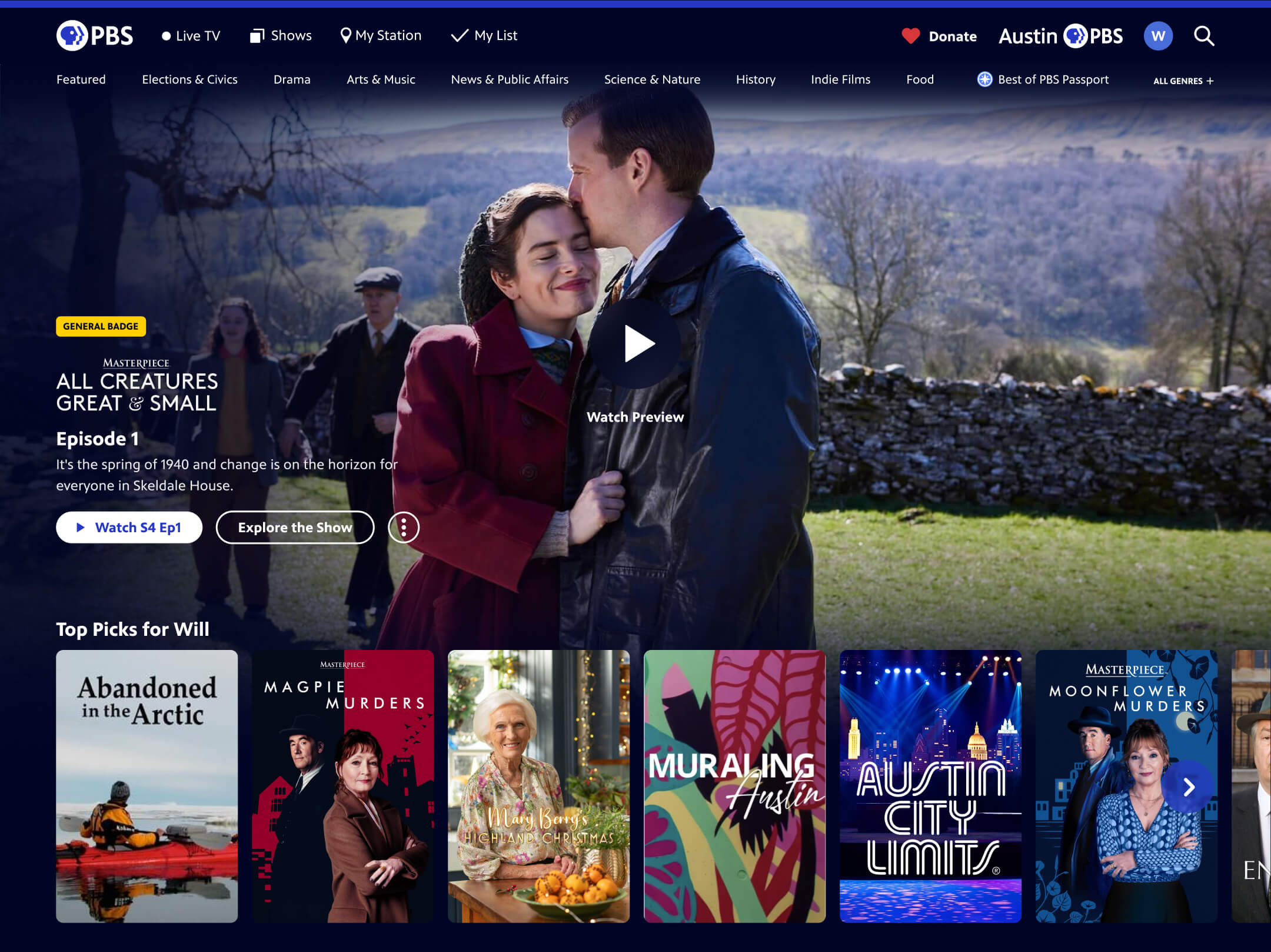 Something that differentiates PBS from other video streaming platforms is that it is comprised of hundreds of local member stations all over the U.S. Visiting PBS.org or the PBS app gives you the opportunity to see content produced within your community. This benefits PBS overall because it helps users understand the value their local station brings. Increased affinity for the station means more people becoming members by donating to their local station. One of our primary design goals was to increase station presence and we did this through several new and improved features: